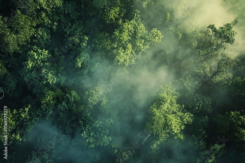© JBMotillon, Fototapeta premium Capture aérienne d'une forêt brumeuse à l'aube..