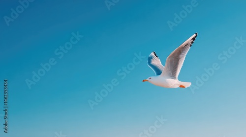 Obraz premium capture serene moment of single bird gliding across clear blue sky its wings...