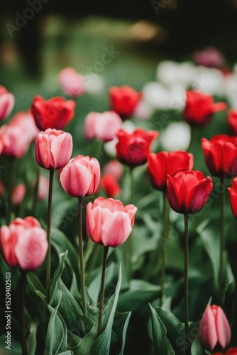© Irfanan, Fototapeta premium Capture Spring, Tulips Blooming in Garden with Vibrant Color of Nature's Beauty.