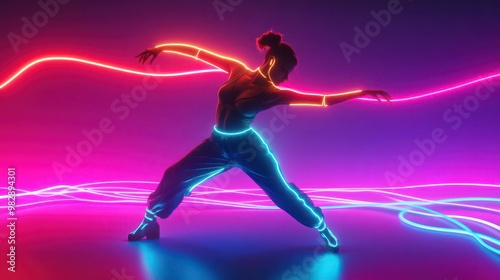© Muhawaii, Fototapeta premium Capture the dynamic essence of a dancer with neon trails in a wide-angle view, rendered in a digital CG 3D format for a modern and sleek aesthetic
