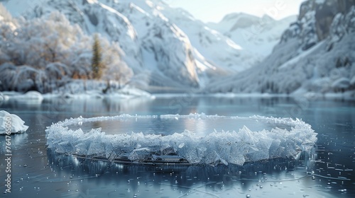 Fototapeta premium Capture the essence of winter chic with an Icy Blue Glass Podium against a Frozen Winter Landscape, perfect for showcasing fashion and skincare products.