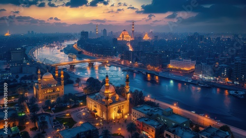 Obraz premium Capture the evening charm of Cairo from above, with illuminated landmarks,...