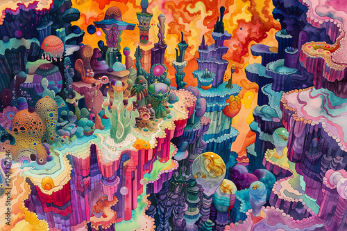 © panyawatt, Fototapeta premium Capture the intricate details of a utopian dreamscape from a birds-eye view in vibrant, dreamy watercolor medium