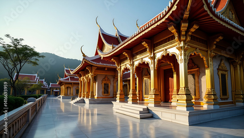 Naklejka premium Capture the Majestic Facades and Intricate Carvings of Vesak Buddhist Temple Architecture: Serene Ambiance Reflecting Divine Heritage for Premium Stock Imagery