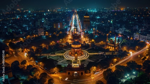Obraz premium Capture the nighttime charm of Delhi from above, with illuminated landmarks,...