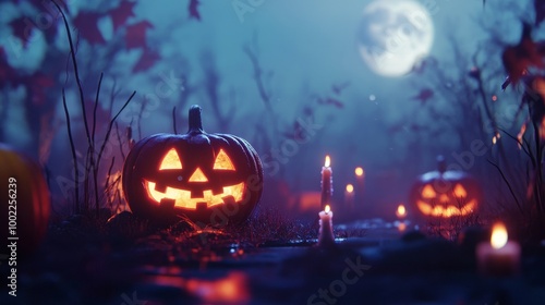 © Littlegirl1398, Fototapeta premium "Capture the spooky essence of Halloween with an eerie yet enchanting scene, featuring glowing jack-o'-lanterns, flickering candles, and shadowy silhouettes against a moonlit night