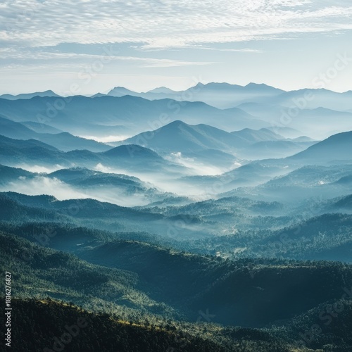© Pornnapa, Fototapeta premium Captured from a wide perspective overlooking vast mountain scenery with drifting mist