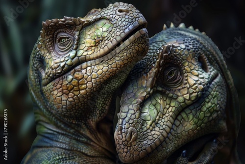 Fototapeta premium Captured is a touching moment between two dinosaur replicas showing what looks like interaction or affection