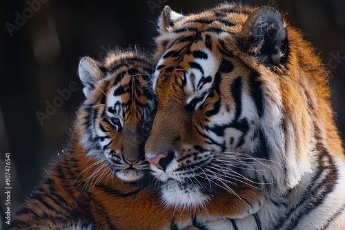 Naklejka premium Captures the tender bond between a mother tiger and her cub, showcasing their affectionate nature.