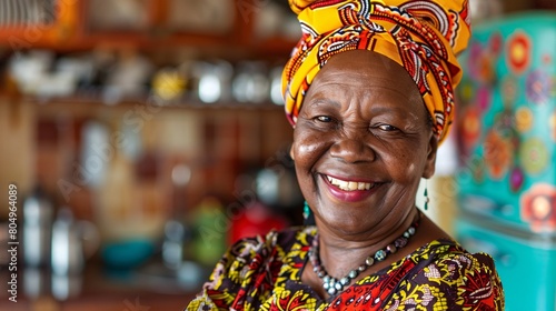 © ckybe, Fototapeta premium Capturing a joyful, contented older woman in her home, dressed in vibrant traditional African garments to celebrate Mother's Day.