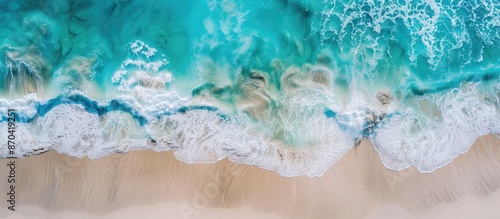 Naklejka premium Capturing a stunning aerial image of a pristine tropical beach with foamy waves and crystal-clear waters, a perfect backdrop for summer vacation, featuring ample copy space.