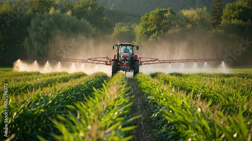 Fototapeta premium Capturing Agricultural Practices: A Tractor Spraying Pesticides on a Corn Field During Spring's Growing Season