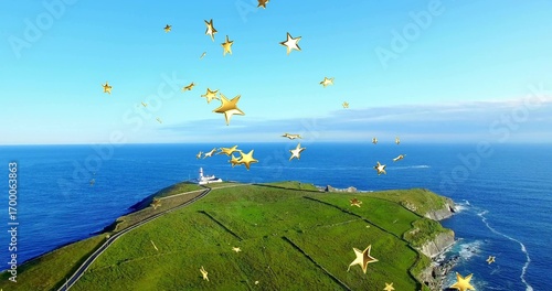 Obraz premium Capturing headland over blue ocean, with winding road leading to white lighthouse and golden stars