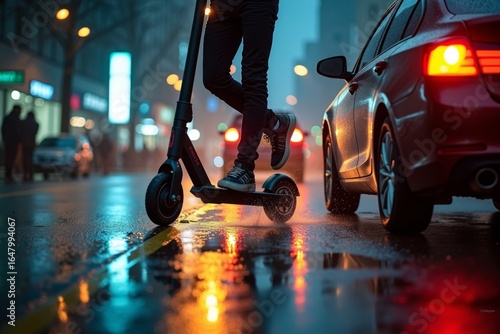 © Vera, Fototapeta premium Capturing the Contrast between Chaos and Stillness: A Creative Photo Idea of a Man on an Electric Scooter Overrun by a Car