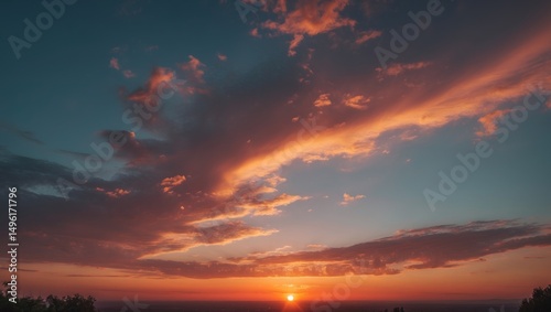 © Lasvu, Fototapeta premium Capturing the sky during sunset with colorful clouds and the setting sun on the horizon.