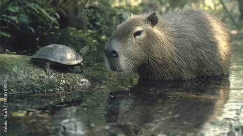 © Shivani, Obraz premium Capybara and Turtles in their natural habitat.