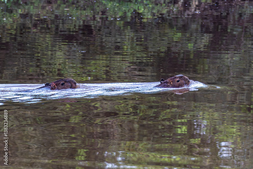 © rudiernst, Obraz premium Capybara, Hydrochoerus hydrochaeris at the Igarape do Urubu River, Delta das Americas to Ilha das Canarias, Brazil. South America