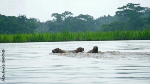 Fototapeta premium Capybaras swimming Amazon river, rainforest background, wildlife