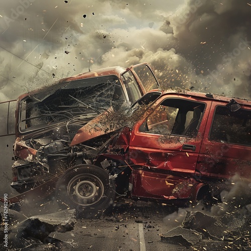 © ChomStyle, Obraz premium Car accident on a road in , car after a collision with a heavy truck