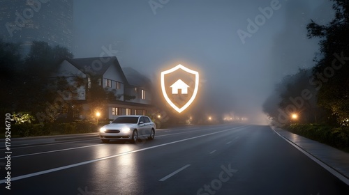 Fototapeta premium Car and house icon within a glowing shield on a foggy twilight road symbolizing security and protection