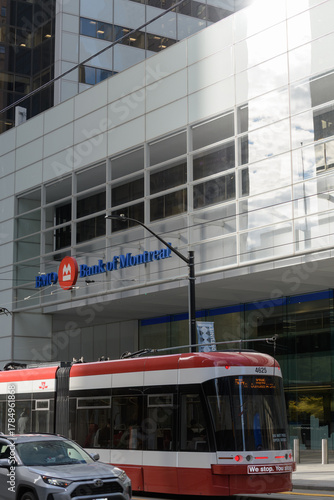 © eugen, Obraz premium car and streetcar stopped in eastbound lane on King St W outside First Canadian Place, BMO, Bank of Montreal branch, at Bay, Toronto