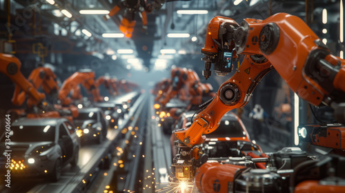 Fototapeta premium car assembly line with multiple robotic arms actively welding and assembling...