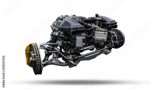 © patruflo, Fototapeta premium Car axle systems with engine. Car chassis with motor and suspension. Automotive industry. High performance car assembly.