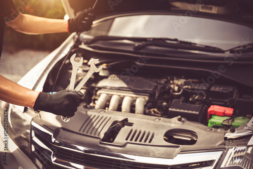 © Eakrin, Obraz premium Car care maintenance servicing technician or auto mechanic holding wrench for fix service repairing change spare part engine problem or insurance support or range of car check or training workshop.