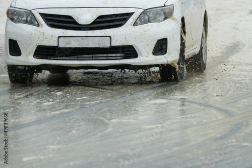 Naklejka premium car closeup on a slippery wet road during inclement weather concept bad road...