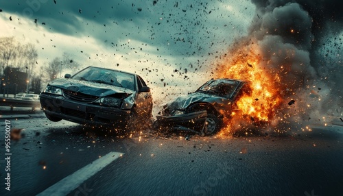Obraz premium Car collision scene capturing the impact of an accident for insurance and...