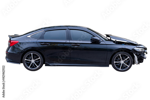 © ISENGARD, Fototapeta premium Car crash, Side view of black sedan car get damaged by accident on the road. damaged cars after collision. isolated on transparent background. PNG File