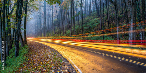 © larryknupp, Obraz premium Car driving though Great Smoky Mountains National Park at daybreak