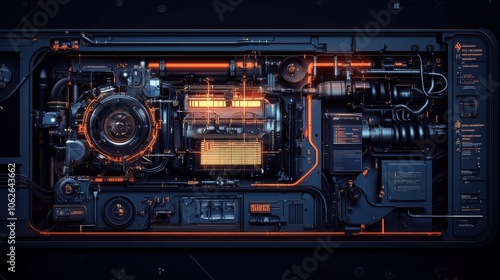 © Dashbow, Fototapeta premium Car engine in orange light isolated on black background.