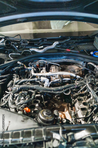 Fototapeta premium Car engine showing turbocharger and manifold in repair shop