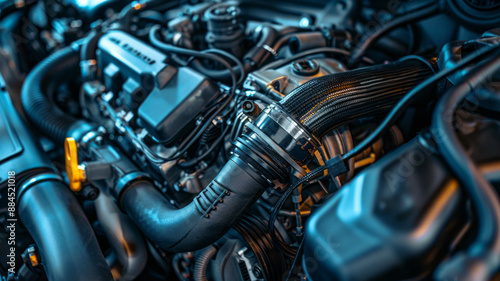 © Pawina, Fototapeta premium car engine with black hoses.generative ai
