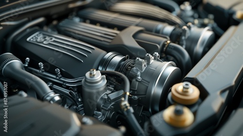 Fototapeta premium Car engine with detailed parts and components displayed. It emphasizes the sophistication and precision engineering under the hood.