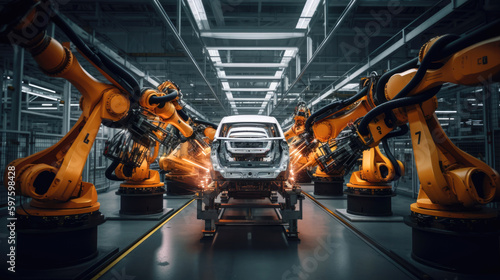 © piai, Fototapeta premium Car factory assembly line with automatic robotic arms working. Generative AI
