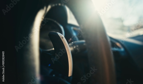 © Ievgen Skrypko, Naklejka premium Car Gear Selector On Steering Column Behind Car Wheel, Close-Up
