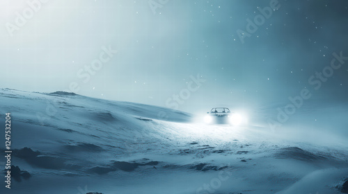 Fototapeta premium car headlights illuminate snowy landscape, creating serene yet mysterious...