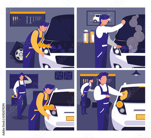 © djvstock, Fototapeta premium car in maintenance workshop with mechanics team