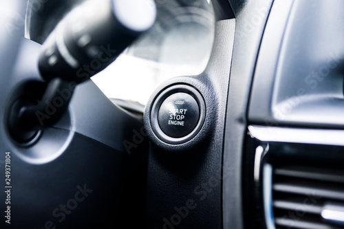 © ROMAN DZIUBALO, Naklejka premium Car interior. Start button. Black and white image.