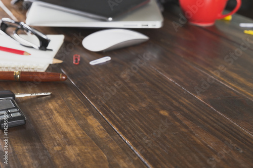 Naklejka premium car key, digital tablet, laptop computer and notebook on office