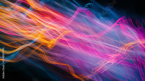 © Sahraya, Obraz premium Car light speed motion effect. Blurred streaks of fast movement, road traffic with long exposure at night. Abstract blue and red neon lines isolated on black background, vector realistic illustration