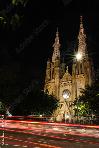 © Kathleen JT, Fototapeta premium car light trails in front of the cathedral , selective focus