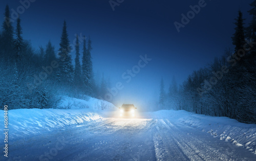 © Iakov Kalinin, Fototapeta premium Car lights in winter Russian forest