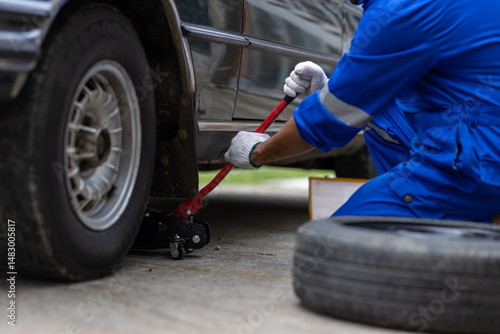 © Wasan, Fototapeta premium Car mechanic using jack to lift car.