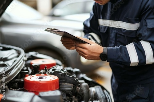 © k, Obraz premium Car Mechanic Working on Engine with Wrench and Clipboard in Automotive Workshop