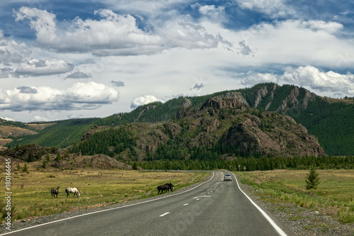 © Lyubov Furs, Naklejka premium car mountains and storm cloud