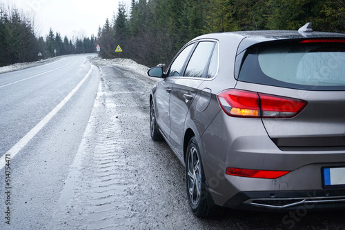 © VI Studio, Fototapeta premium Car on a winter road in the forest. Road Trip Concept.