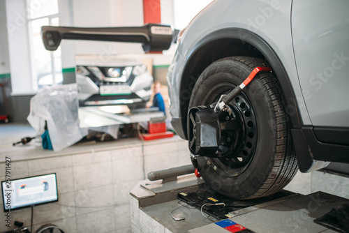 Fototapeta premium Car on collapse of convergence stand, auto-service